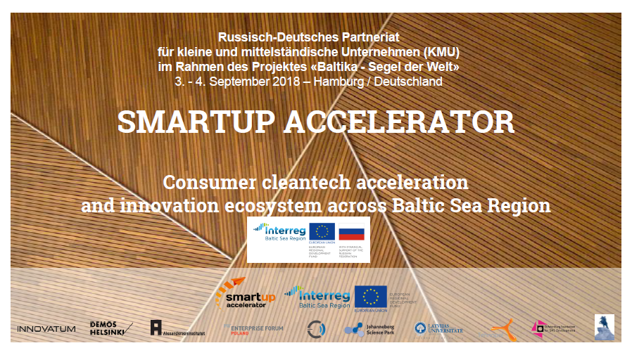 Международный консорциум «Санкт-Петербургский кластер чистых технологий для городской среды» в Гамбурге - городе побратиме Санкт-Петербурга 3 сентября 2018 презентовал проект “SmartUp Accelerator”, как часть международной платформы «Кластер Устойчивого Развития 2030», объединяющей проекты транснационального и приграничного сотрудничества Санкт-Петербурга.