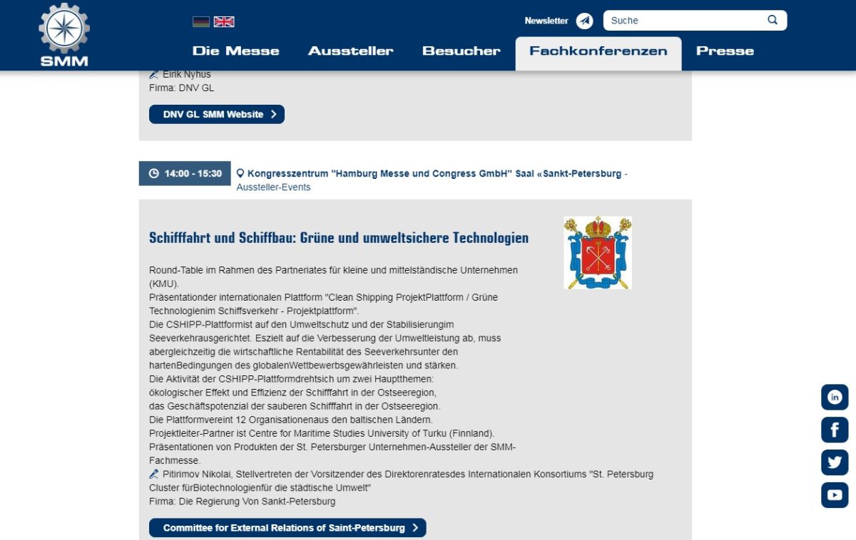 4 сентября 2018 международный консорциум «Санкт-Петербургский кластер чистых технологий для городской среды» провел в Гамбурге (Германия) на вставке судостроения «SMM» круглый стол «Судоходство и судостроение: чистые и безопасные технологии». Мероприятие прошло в рамках первого Российско-Германского Партнериата малого и среднего бизнеса. На круглом столе были представлены международные программы и проекты. Участников круглого стола приветствовали: вице-губернатор Санкт-Петербурга С.Н.Мовчан и президент Германо-российского Экономического союза Т.Овербэк.