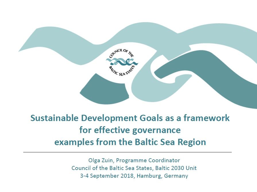 Госпожа Olga Zuin / Ольга Цуин, Council of the Baltic Sea States Secretariat Programme Coordinator - Baltic 2030 Unit / Совет Государств Балтийского моря - Программный координатор Baltic 2030 презентовала “Sustainable Development Goals as a framework for effective governance – examplesfrom the Baltic Sea Region / Цели устойчивого развития как основа эффективного управления: лучшая практика Региона Балтийского моря”.