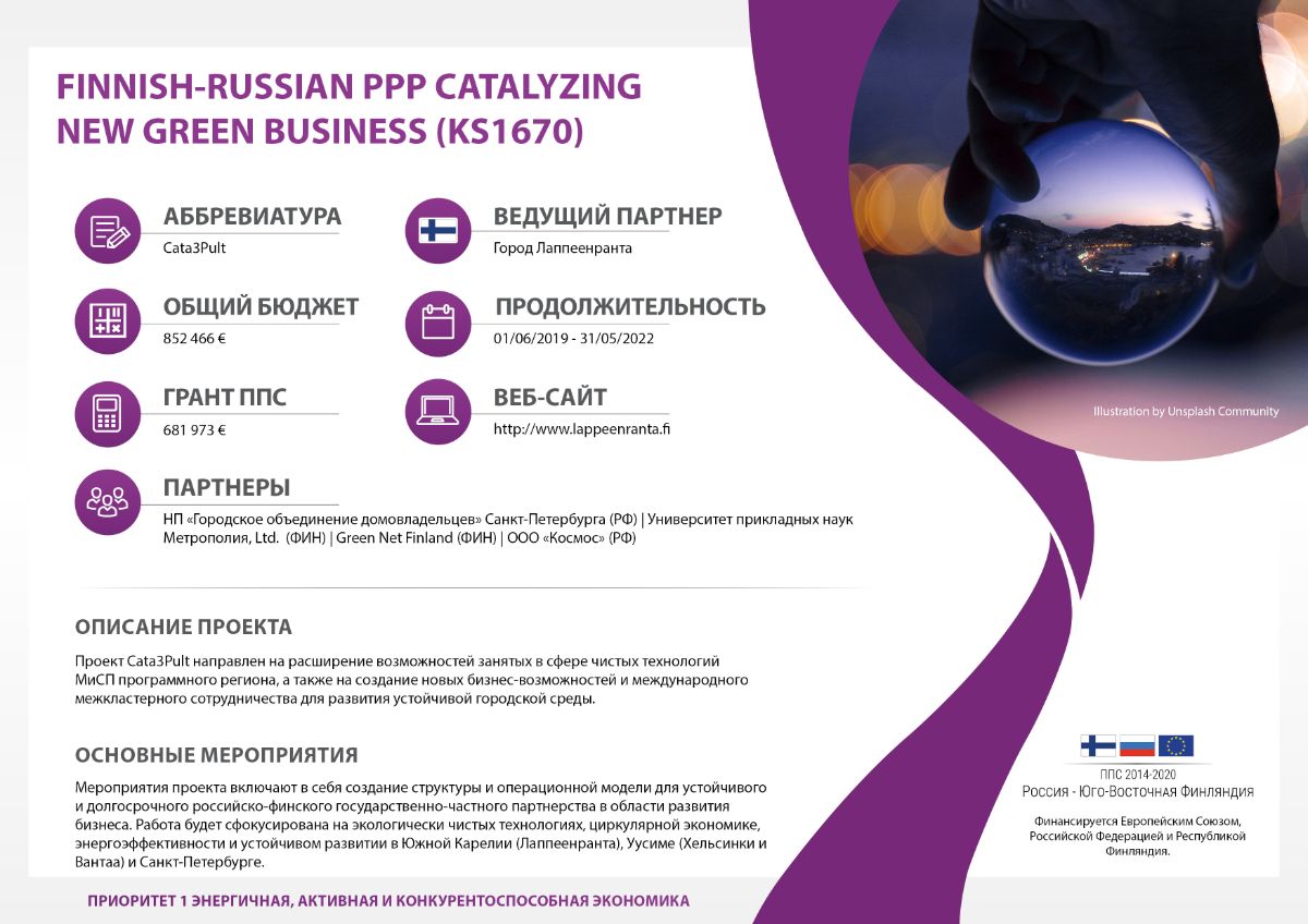 8 июля 2019 года. Международный консорциум «Санкт-Петербургский Кластер Чистых технологий для городской среды» в лице НП «Городское объединение домовладельцев» - специализированной организации Кластера объявляет конкурс по выбору независимого и квалифицированного внешнего контроллера первого уровня по проекту Cata3Pult Программы приграничного сотрудничества «Россия-Юго-Восточная Финляндия» ППС 2014-2020. Конкурс пройдет в два этапа.