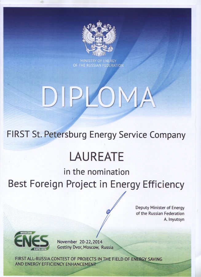 - Диплом Всероссийского конкурса реализованных проектов в области энергосбережения и повышения энергоэффективности ENES 2014. Номинация: Лучший зарубежный проект области повышения энергоэффективности рекомендованный для внедрения в Российской Федерации;