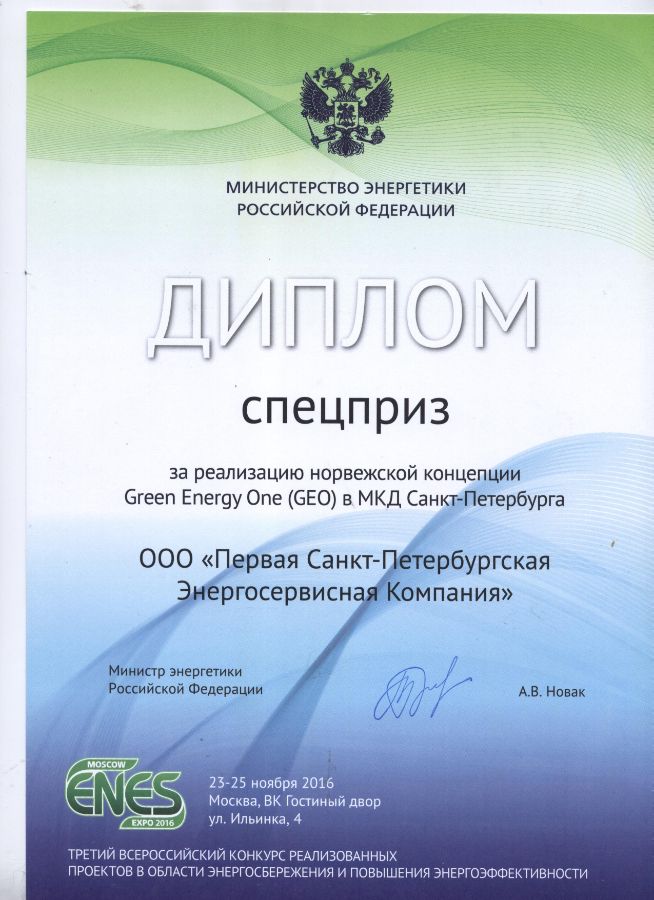 - Диплом Всероссийского конкурса реализованных проектов в области энгергосбережения и повышения энетгоэффективности» ENES 2016 за реализацию норвежской концепции Green Energy One (GEO) в МКД Санкт-Петербурга