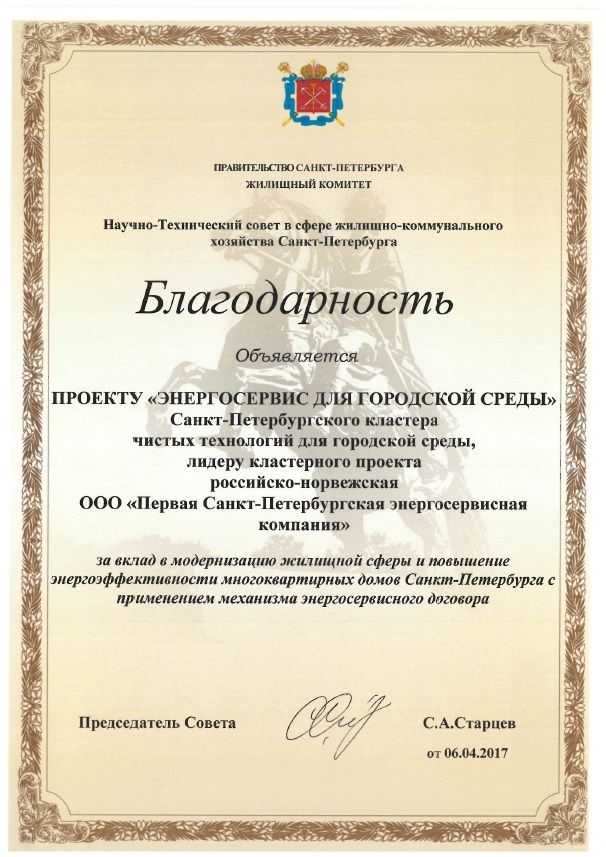 - Благодарность Научно-технического Совета в сфере ЖКХ Санкт-Петербурга в 2017 году проекту «Энергосервис для городской среды» Санкт-Петербургского кластера чистых технологий для городской среды за вклад в модернизацию жилищной сферы и повышение энергоэффективности многоквартирных домов Санкт-Петербурга с применением механизма энергосервисного договора.