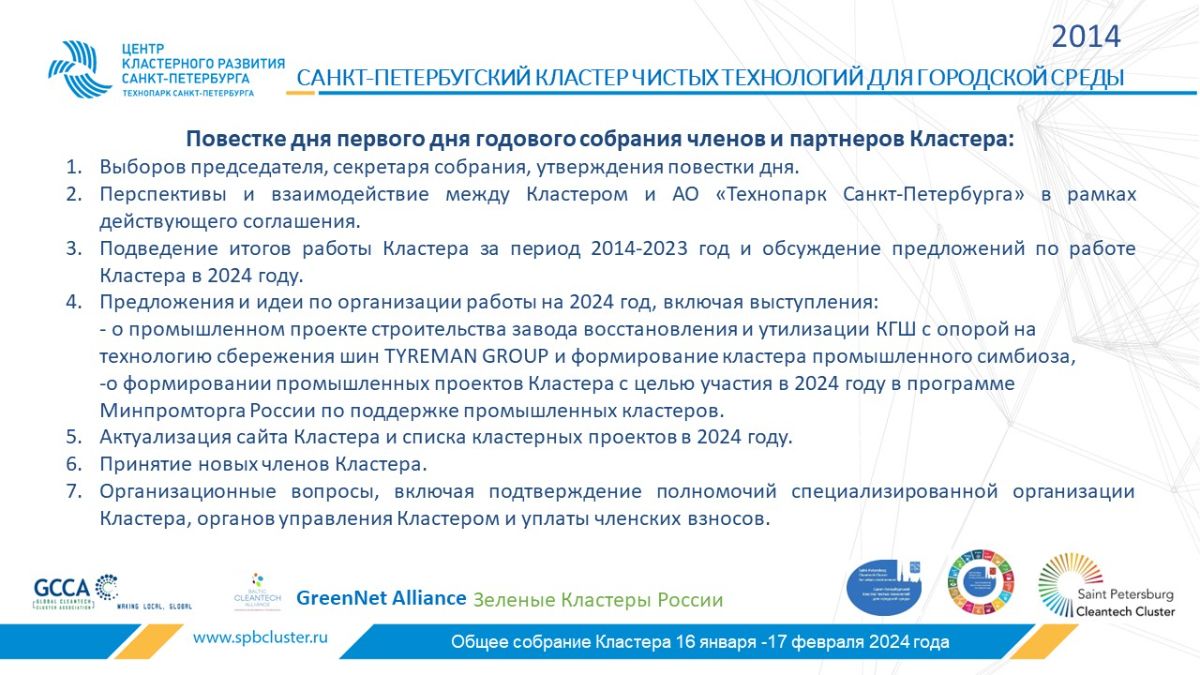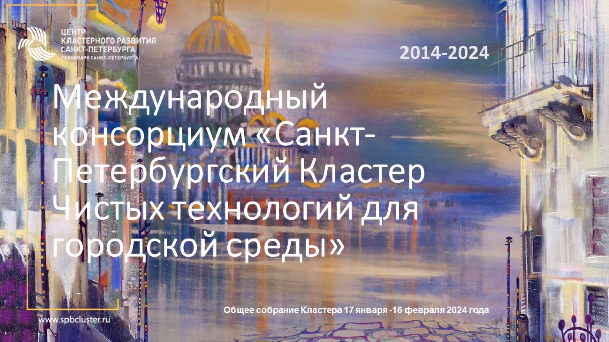 17 января (среда) 2024 года с 15:00 до 17:00 (PM Москва) в конференц-зале «Южный» Центра Кластерного Развития АО «Технопарк Санкт-Петербурга» по адресу: Санкт-Петербург, Проспект Медиков, дома 3−5, литера, А (5 минут от ст. м. Петроградская) открылось общее собрания членов международного консорциума «Санкт-Петербургский Кластер Чистых технологий для городской среды».