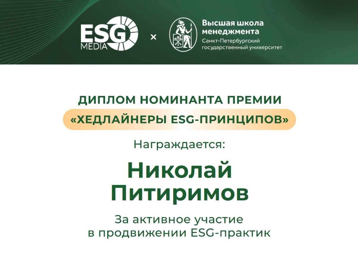 Питиримов Николай, сопредседатель Совета директоров Санкт-Петербургского кластера чистых технологий для городской среды получил диплом номинанта премии за активное участие в продвижении ESG-практик.