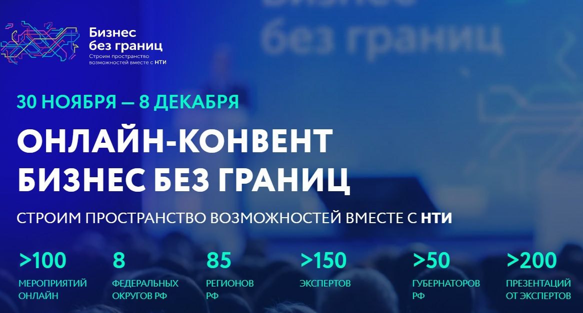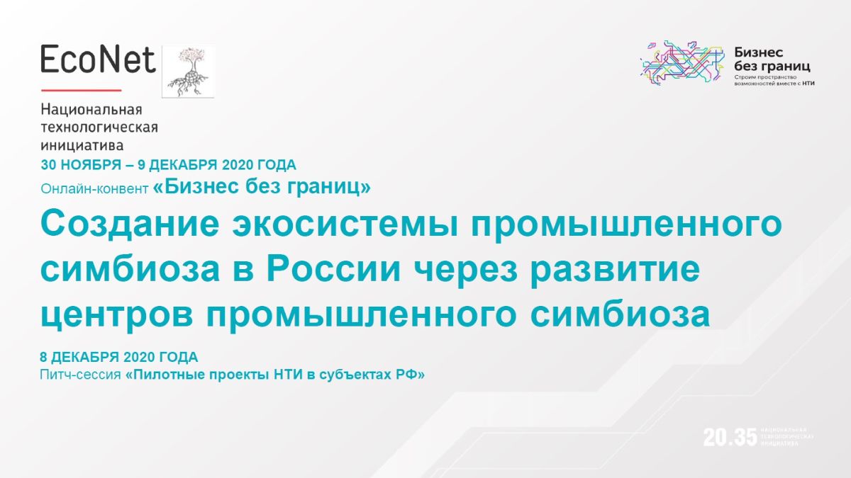 8 декабря 2020 года. Заключительным мероприятием онлайн-ковента «Бизнес без границ» станет питч-сессия «Пилотные проекты НТИ в субъектах РФ», где презентуются кейсы успешных проектов, которые уже реализуются совместно с субъектами РФ по направлениям НТИ. На мероприятии будут представлены 2 проекта членов международного консорциума «Санкт-Петербургского Кластера Чистых технологий для городской среды»: «РОББО Инженерный инновационный класс» и «Создание экосистемы промышленного симбиоза в России через развитие центров промышленного симбиоза».