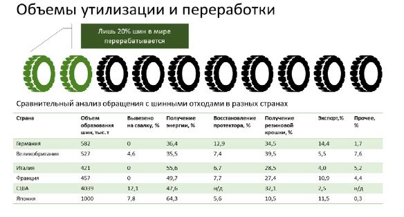 Мировая шинная промышленность сегодня – это 3,3 млрд шин и свыше 200 млрд долларов в год. В России каждый месяц производят около 3,5 млн легковых и грузовых пневматических шин. В составе каждой такой шины – синтетический и природный каучук (55–60%), сажа, металл (25%), ткань, окиси цинка и серы. Ежегодно в мире более 10 млн т покрышек выходят из употребления. Автомобильным шинам присужден IV класс опасности. Большинство способов обращения с этим «малоопасным» типом отходов оказывают негативное влияние на окружающую среду. При захоронении шины разлагаются 120–140 лет, при этом возникают неконтролируемые пожары на свалках, грунтовые воды выносят токсичные органические соединения, а земля становится непригодна для ведения хозяйственной деятельности.