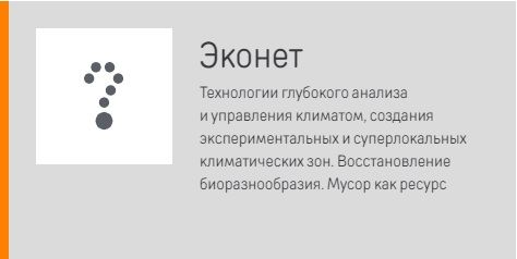 В настоящее время в рамках НТИ начинается работа по проектированию и созданию новых рынков (в дополнение к девяти утверждённым), которая будет проводиться в формате Форсайта НТИ 2.0. Для создания рынка «Эконет» необходима коллективная работа экспертов по технологиям глубокого анализа и управления климатом, создания экспериментальных и суперлокальных климатических зон, восстановления биоразнообразия и переработки отходов.